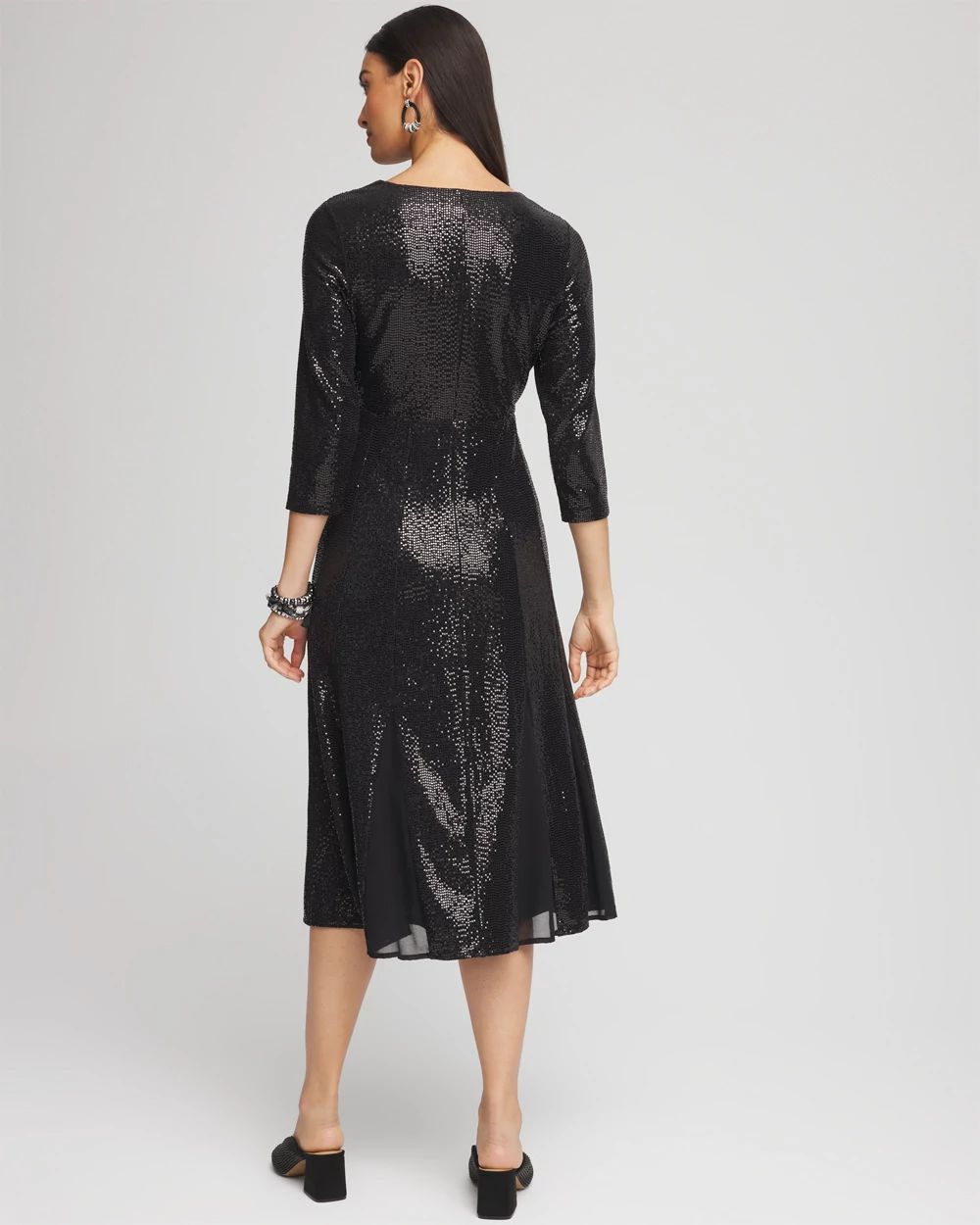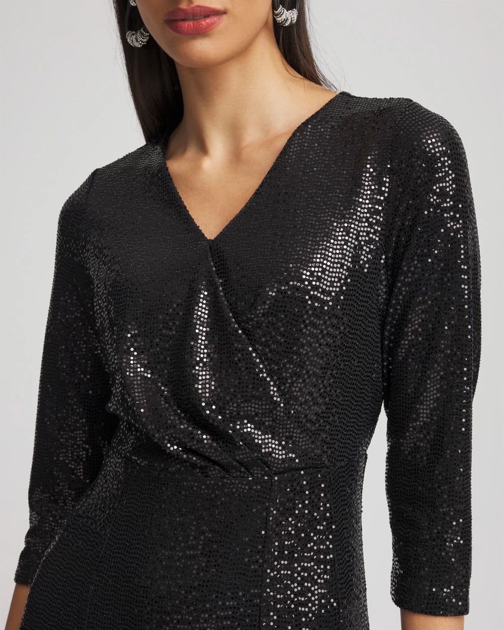 We know you’re going to love our new Surplice Sequined Midi Dress as much as we do. Featuring spectacular sequined detailing and refined chiffon godets at the hem. Wear this standout style for formal or casual occasions.
