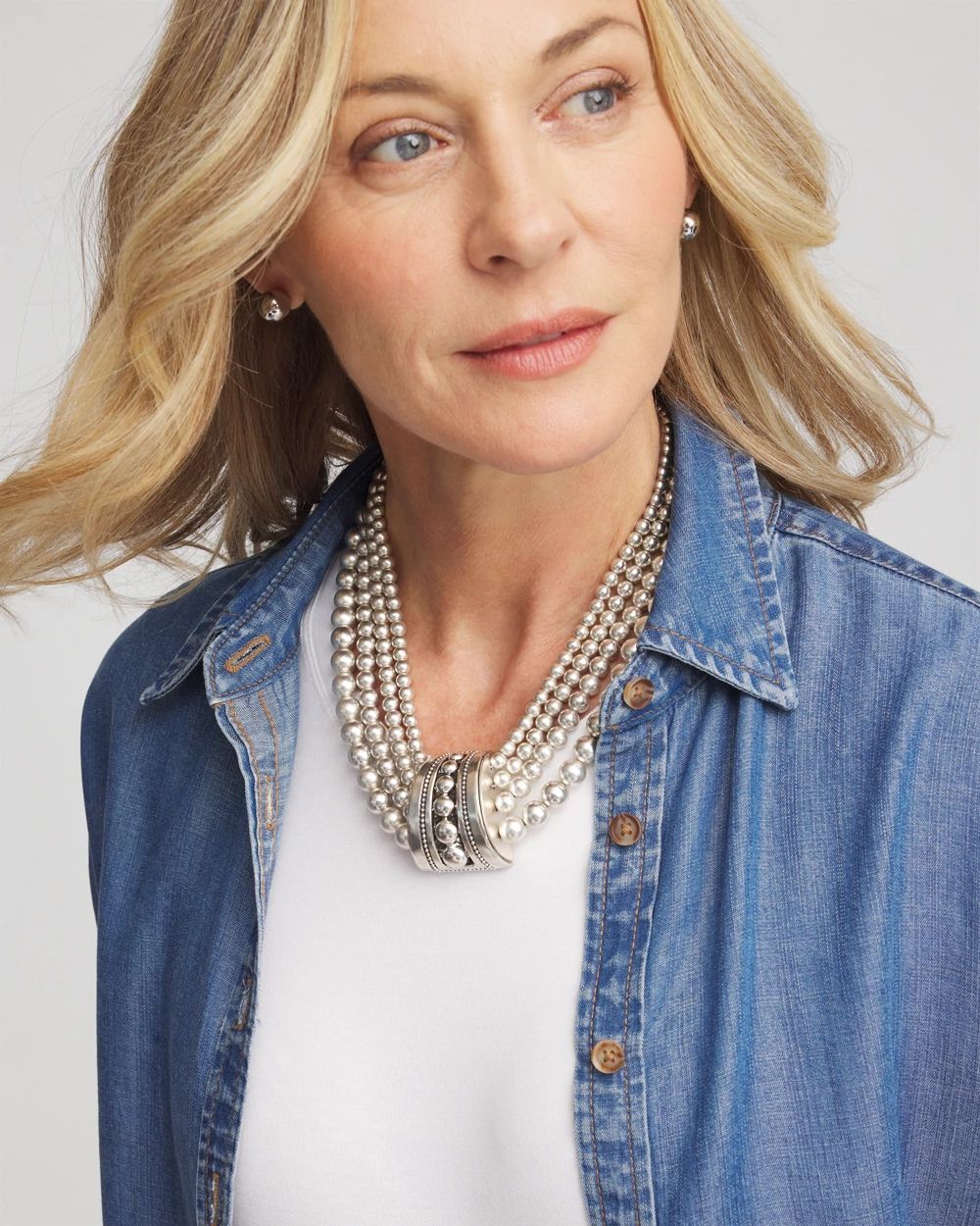 A stunning creation — four strings of shiny silver beads, crafted into one bib necklace. Featuring an eye-catching center holding the strands together. This organic Chico's summer adornment pairs perfectly with your dressy or casual summer outerwear. Inspired by 'the Paris of the South' Argentinian high-style. Pair with matching bracelet or mix and match with like pieces from Chico's new Regional Gems Collection.