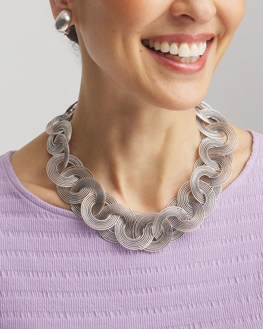Hand crafted concentric circles, made from a combination of silvertone steel and brass, linked together to magically form into a carefree, weightless bib necklace. The perfect lightweight statement necklace for v-neck and scoop neck tops and dresses. Perfect with evening wear or elevating casual wear. Pair with the matching earrings and Chico's Heated Curves Collection.