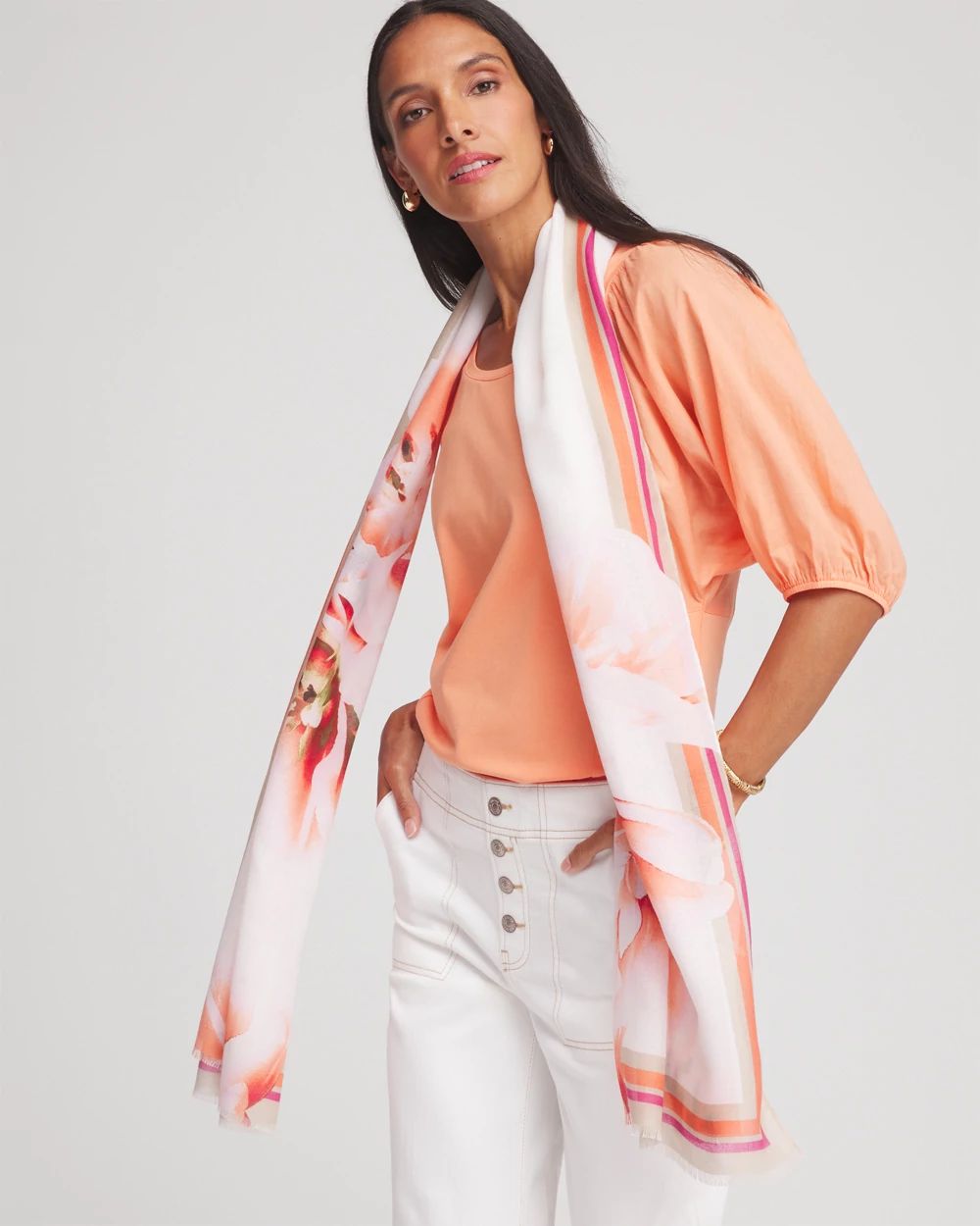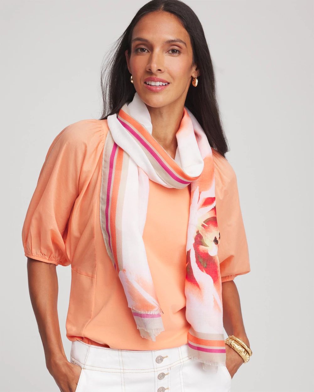 This gorgeous scarf is cozy, breezy, vibrant, and easy to fold, wrap, and style in limitless ways. Long, lightweight scarf with an eyelash finish. Wear around your neck, head, wrist, or as an accessory for your purse or beach bike. Pair with our scarf clip to add a touch of shine.