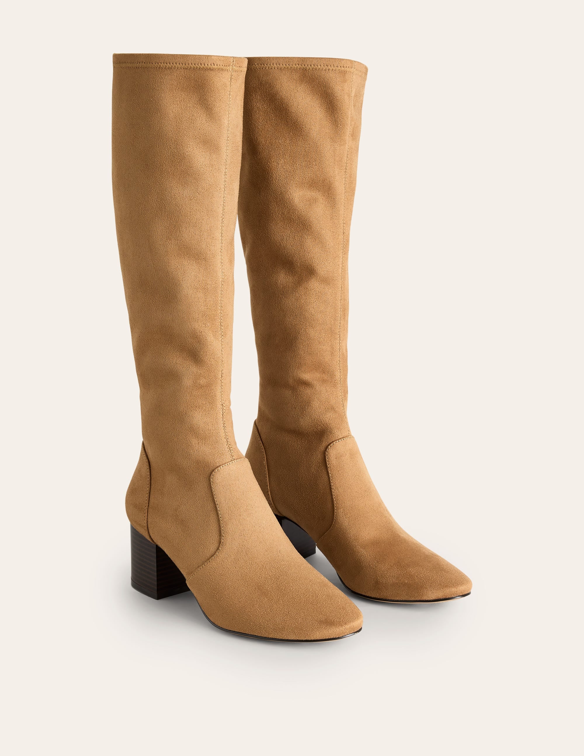 Polished and sleek, these faux suede knee boots elevate every look. They're set on a block heel and finished with a pointed toe. Busy social calendar coming up? They’re ready.